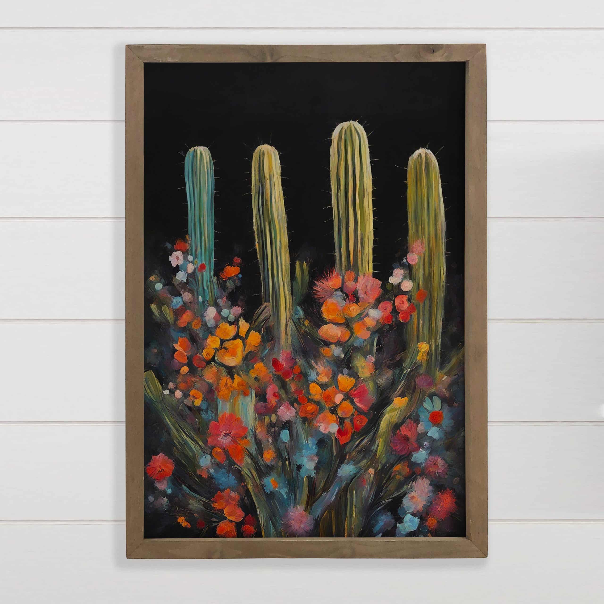 Blooming Midnight Cactus – Cactus Canvas Art – Framed Decor: 18×24″ Large Canvas Art with Thick Wood Frame