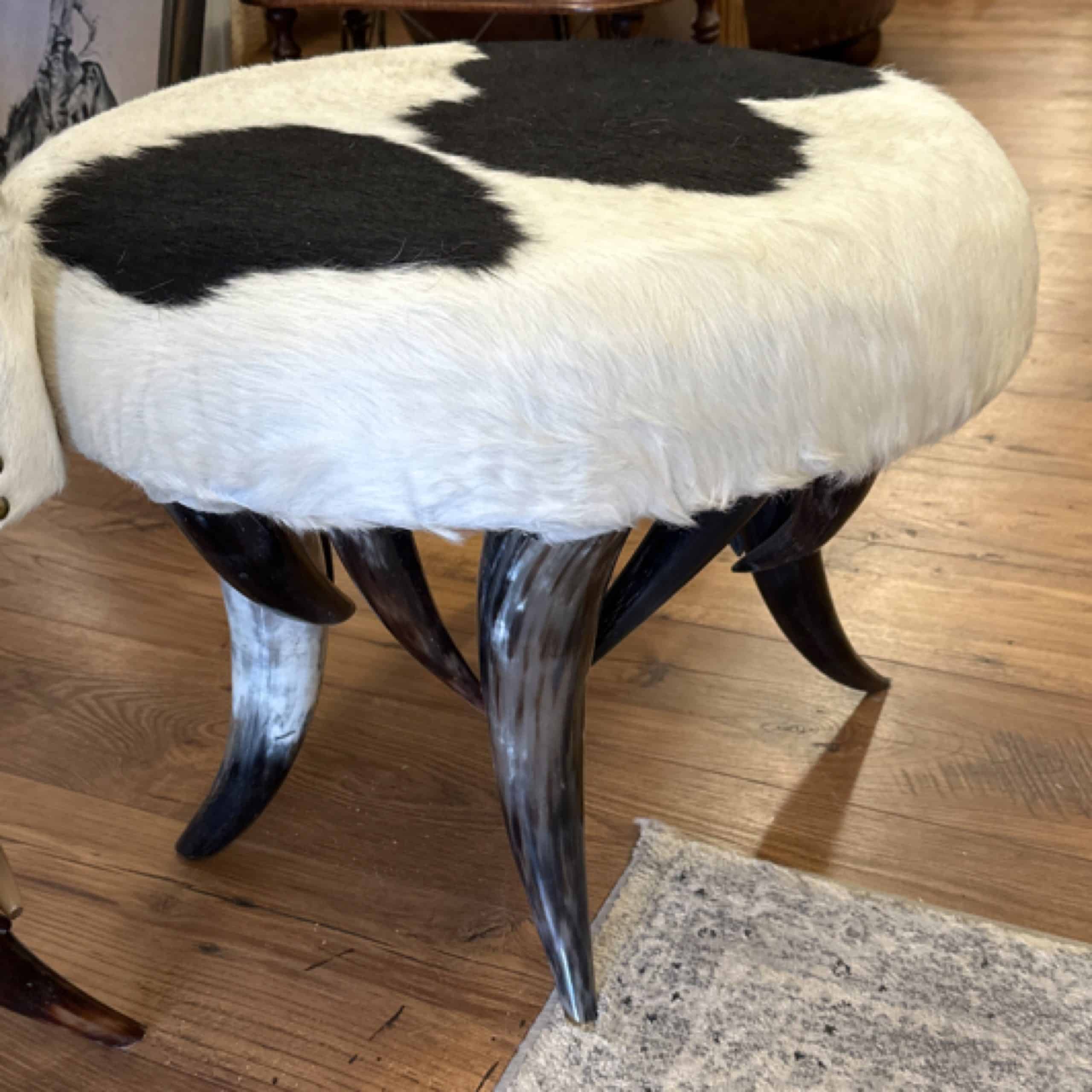 This Cowhide and Horn Round Bench features a luxurious design with a unique combination of natural cowhide upholstery and polished horn accents. Built with durable materials, it offers both style and functionality for any space.