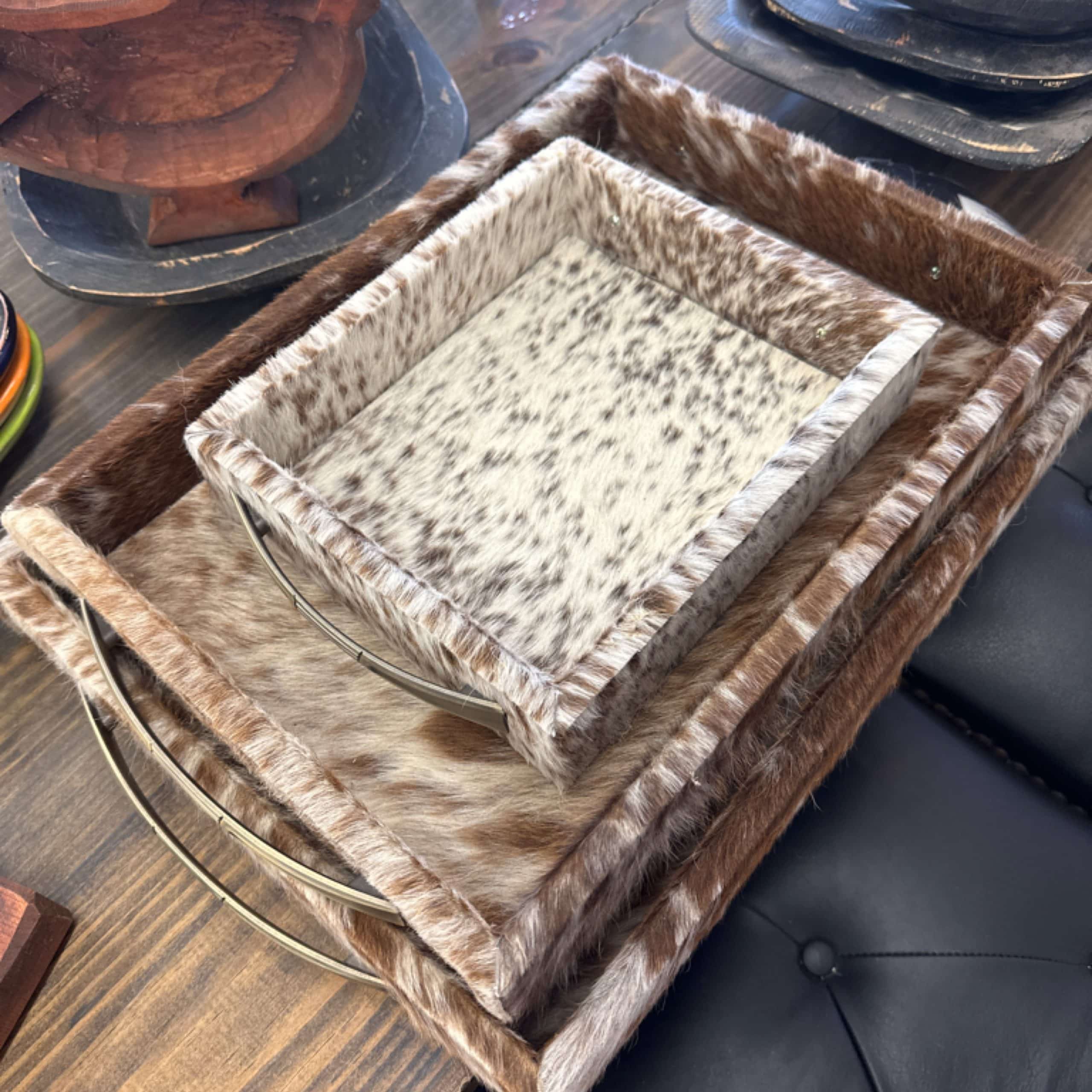 This set of three cowhide trays combines durable craftsmanship with a stylish design, perfect for organizing or displaying items in any space. Their versatile use makes them an elegant addition to both modern and rustic decor.