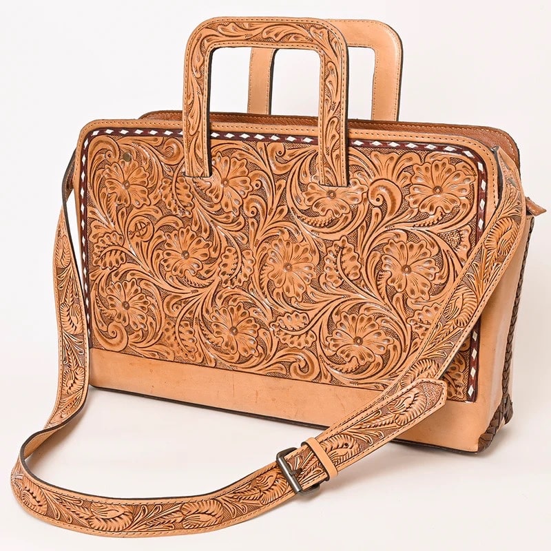 Crafted from genuine leather and finished with detailed hand-tooled floral carving, this American Darling tote bag offers strength, structure, and dependable daily usability. Designed with sturdy handles, an adjustable strap, and smooth-access compartments, it provides both comfort and practicality for work, travel, or everyday Western lifestyle needs.