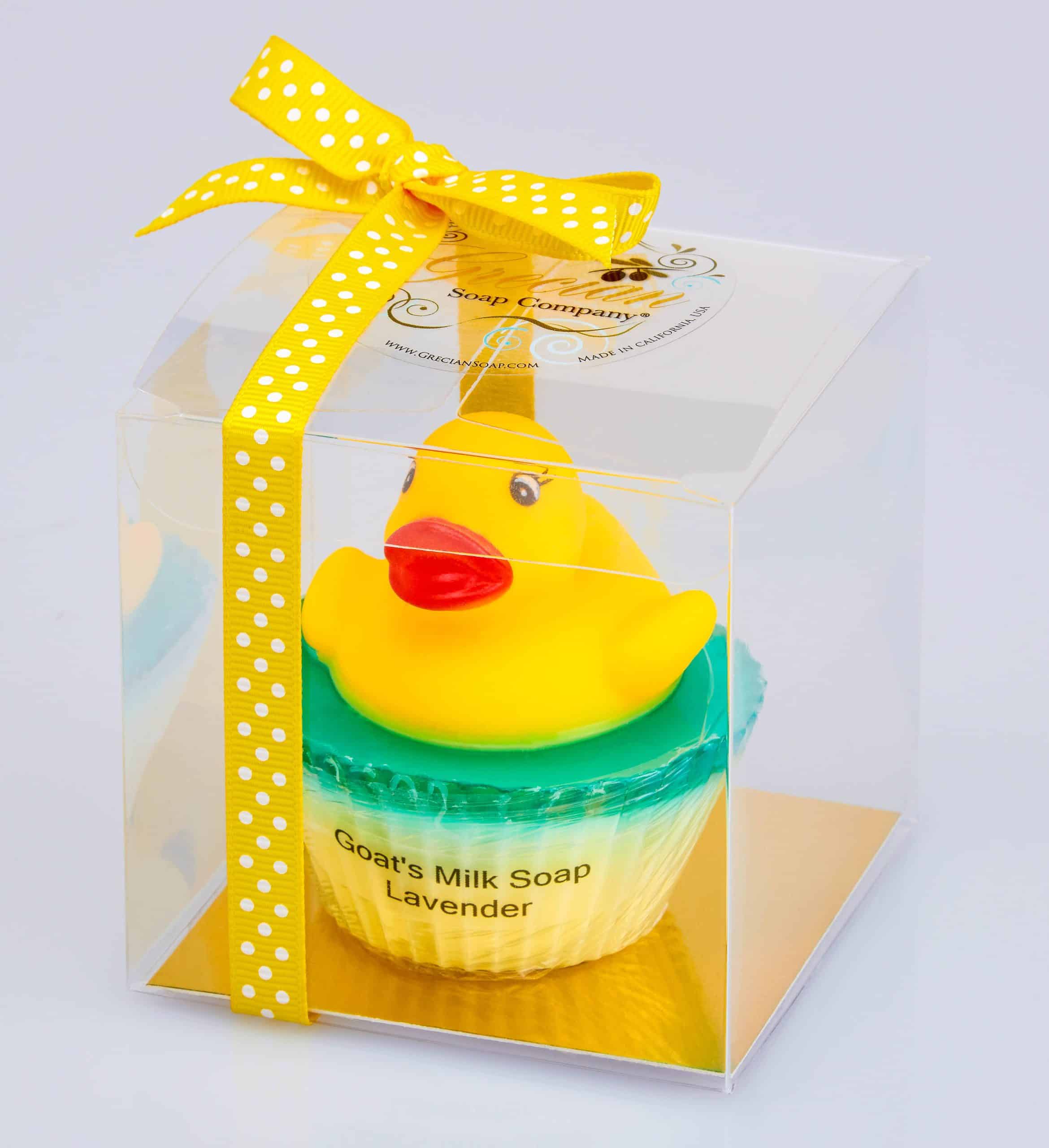 – Real rubber duck on cupcake-style soap base