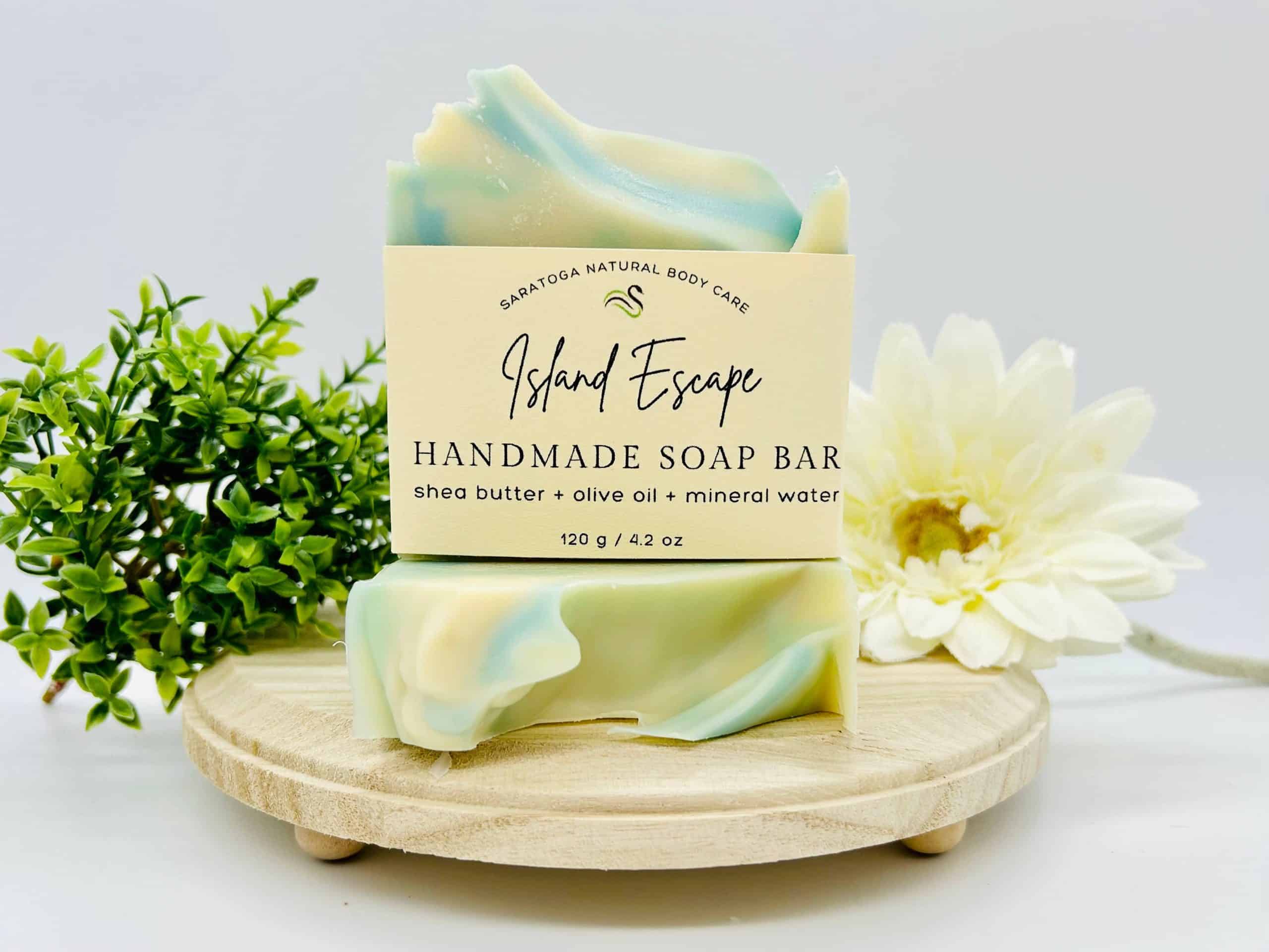 Handcrafted soap that features a deliciously sweet and tropical aroma of a mandarin, coconut, and red currant.