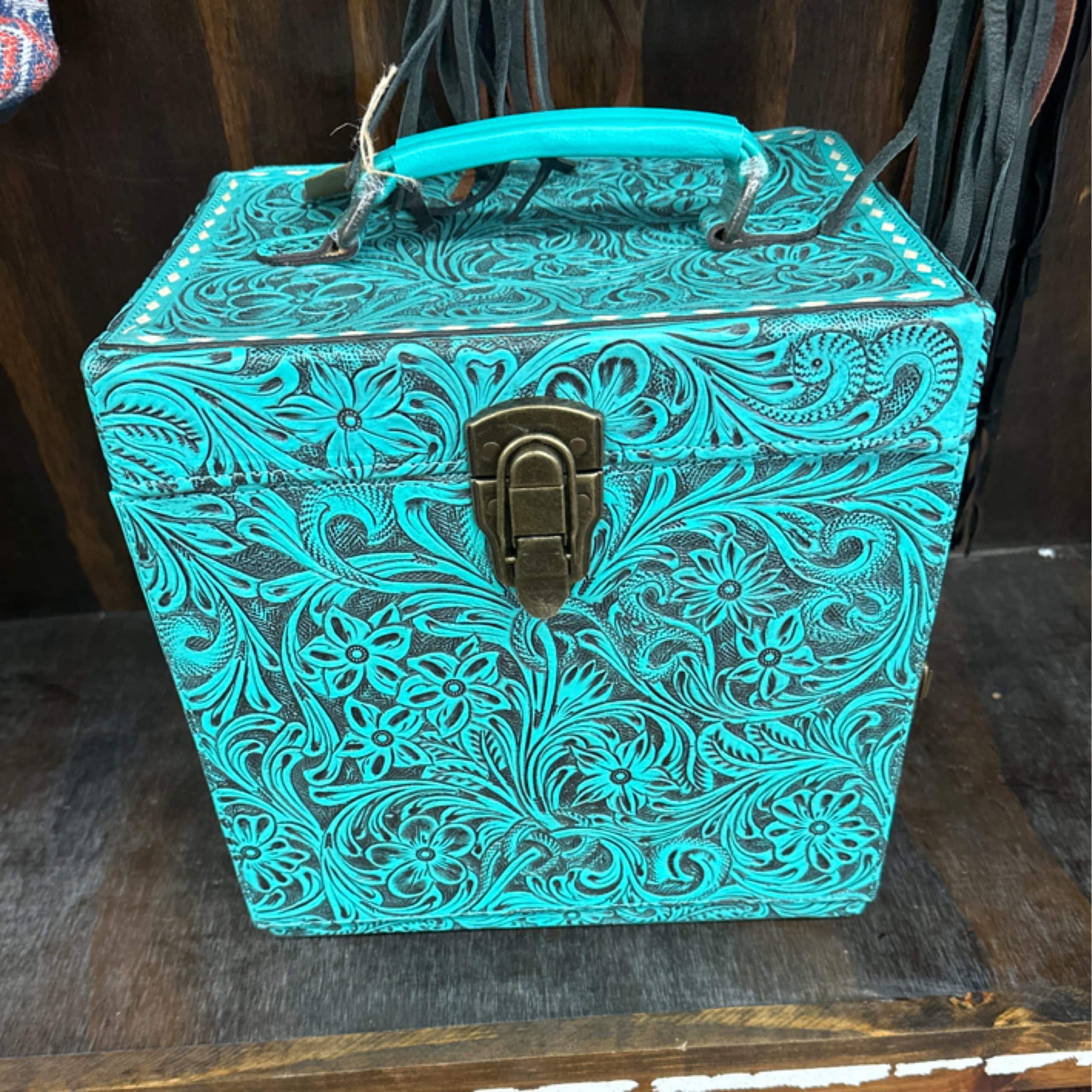 The Jumbo Tooled Leather Turquoise Jewelry Case offers a spacious interior crafted from genuine leather, featuring intricate tooling and a vibrant turquoise finish. Perfect for organizing and protecting your jewelry collection in style.