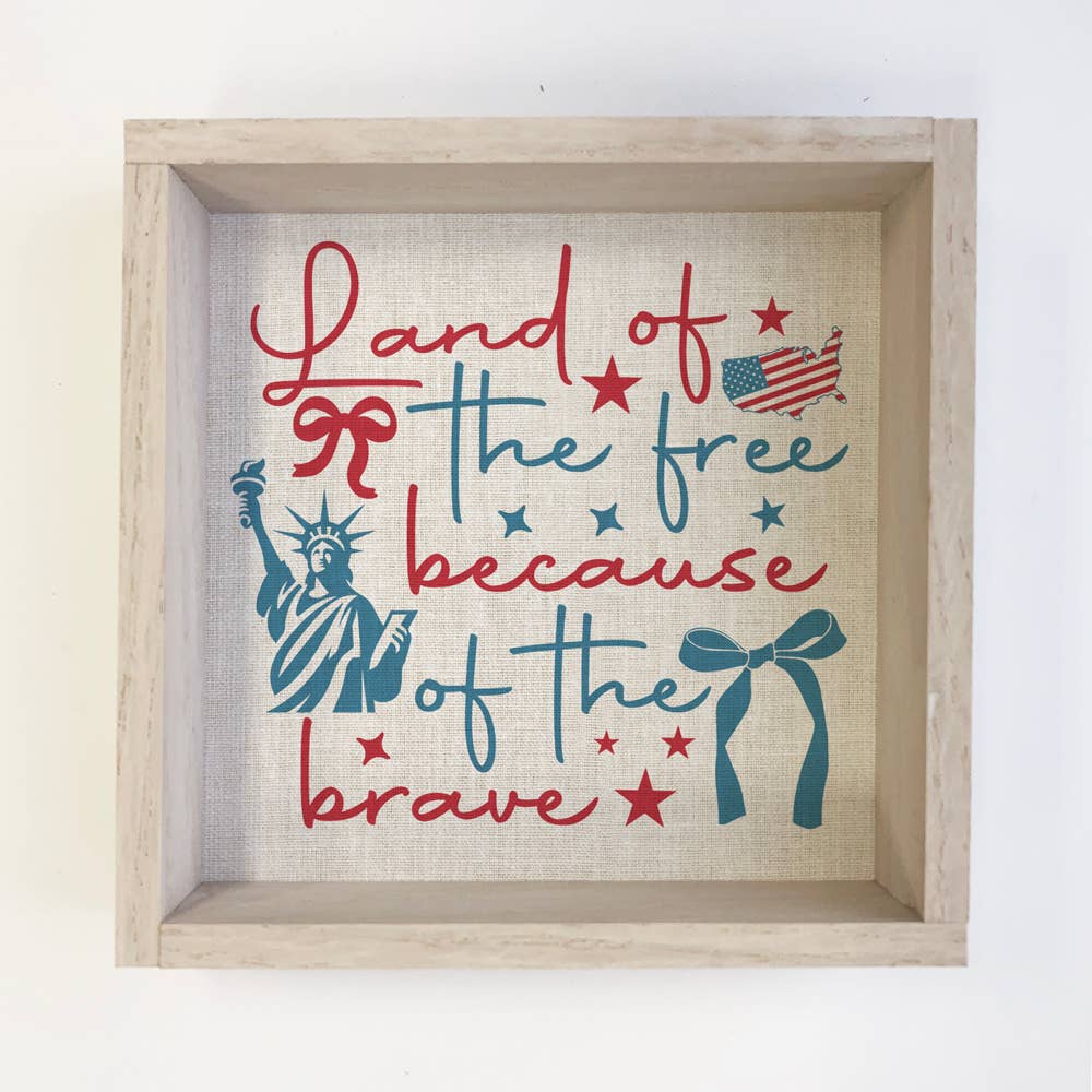 Celebrate American pride with this charming "Land of the Free Because of the Brave" art print featuring patriotic colors and playful accents. Perfect for a farmhouse, cottage or Americana-style home, it looks wonderful in a living room, entryway, or kitchen, adding a cheerful and meaningful patriotic touch.