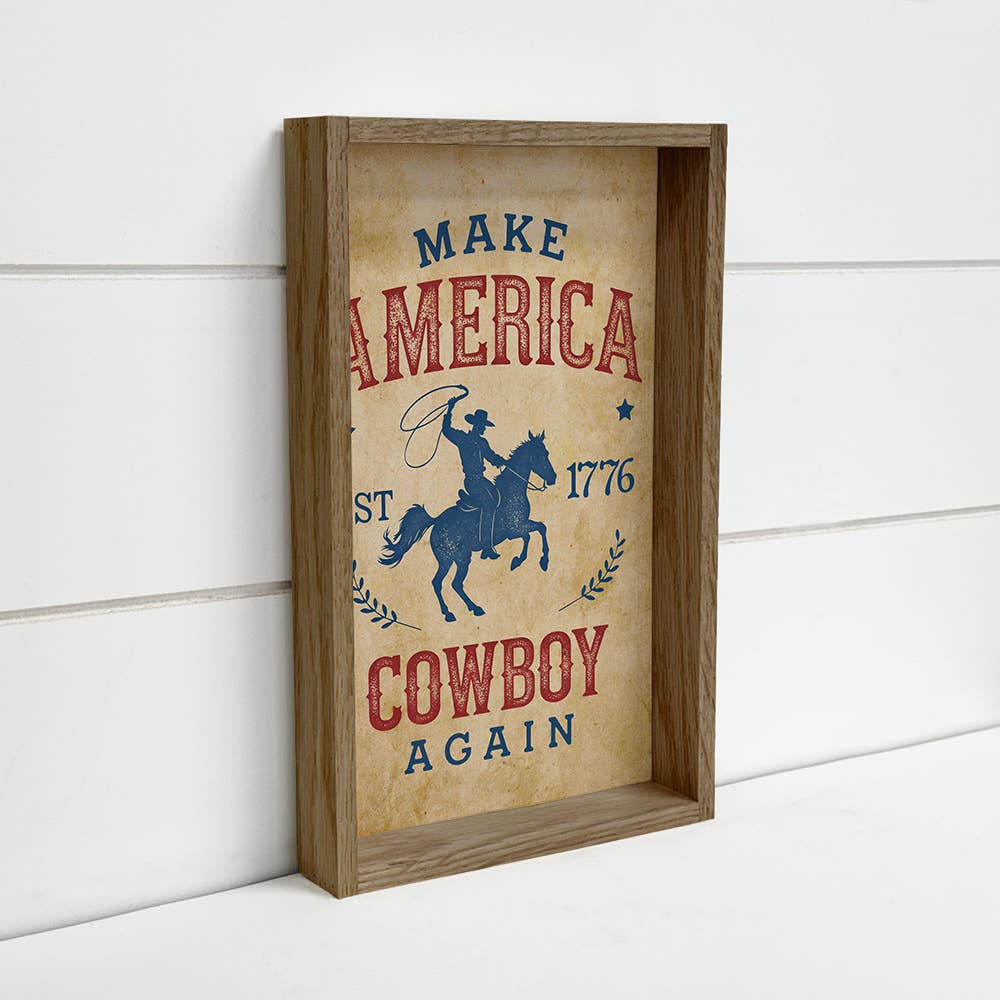 Add bold Western charm with this vintage-inspired "Make America Cowboy Again" art print, featuring a classic rodeo silhouette and distressed Americana tones. Perfect for a farmhouse or rustic ranch-style home, it makes a standout statement in a living room, office or man cave.