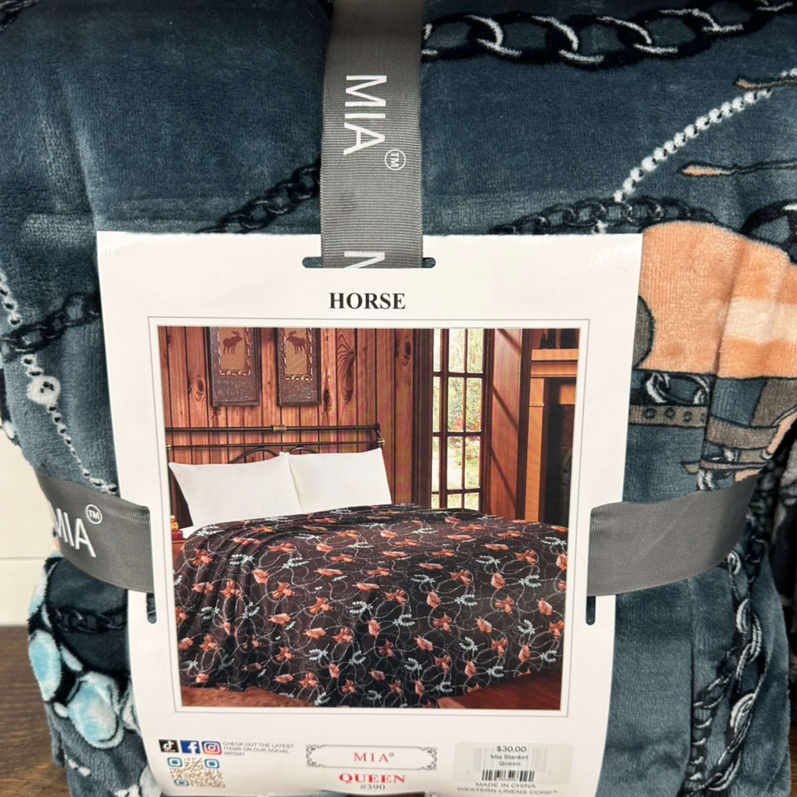 The Mia Blanket in Turquoise Horse features a soft and cozy fabric paired with vibrant colors and a striking equestrian design. Perfect for adding warmth and a bold touch of style to your space.