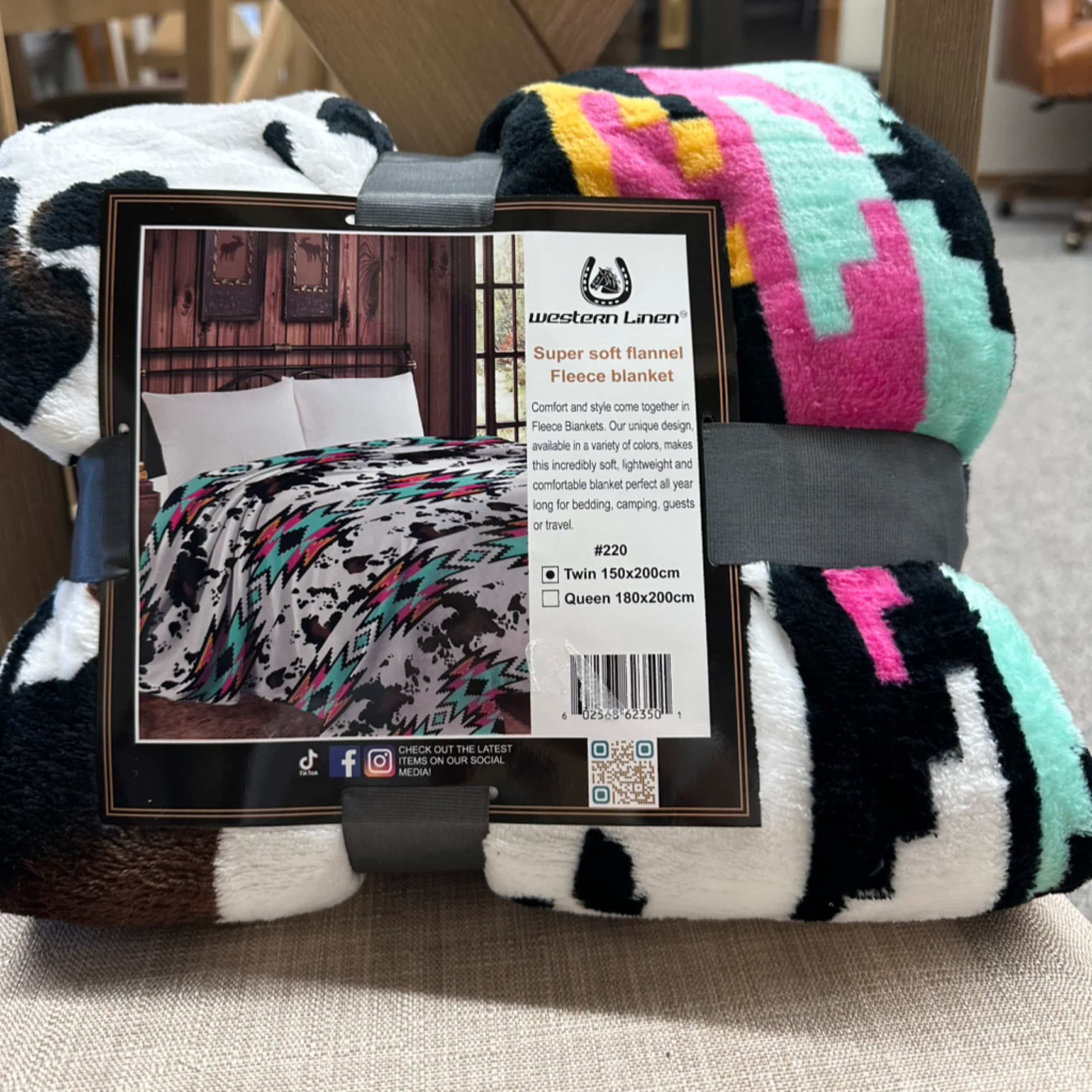 The Mia Super Soft Flannel Fleece Blanket features an eye-catching colorful cowprint Aztec design, paired with ultra-soft fabric for maximum comfort. Perfect for staying cozy and warm while adding a vibrant touch to any room.