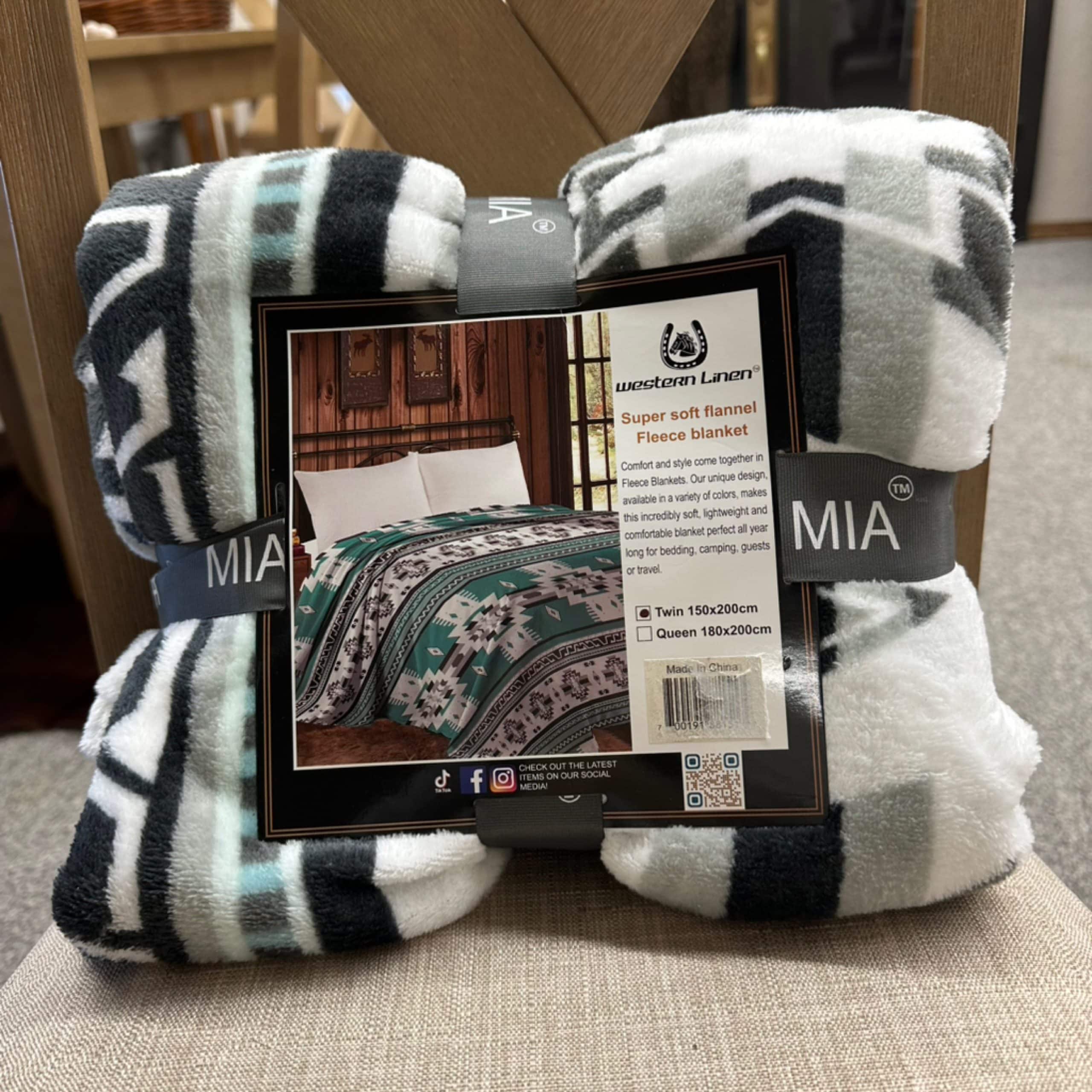 The Mia Super Soft Flannel Fleece Blanket in Green Aztec features ultra-soft material and a stylish Aztec design, providing cozy warmth and a modern touch to any space.