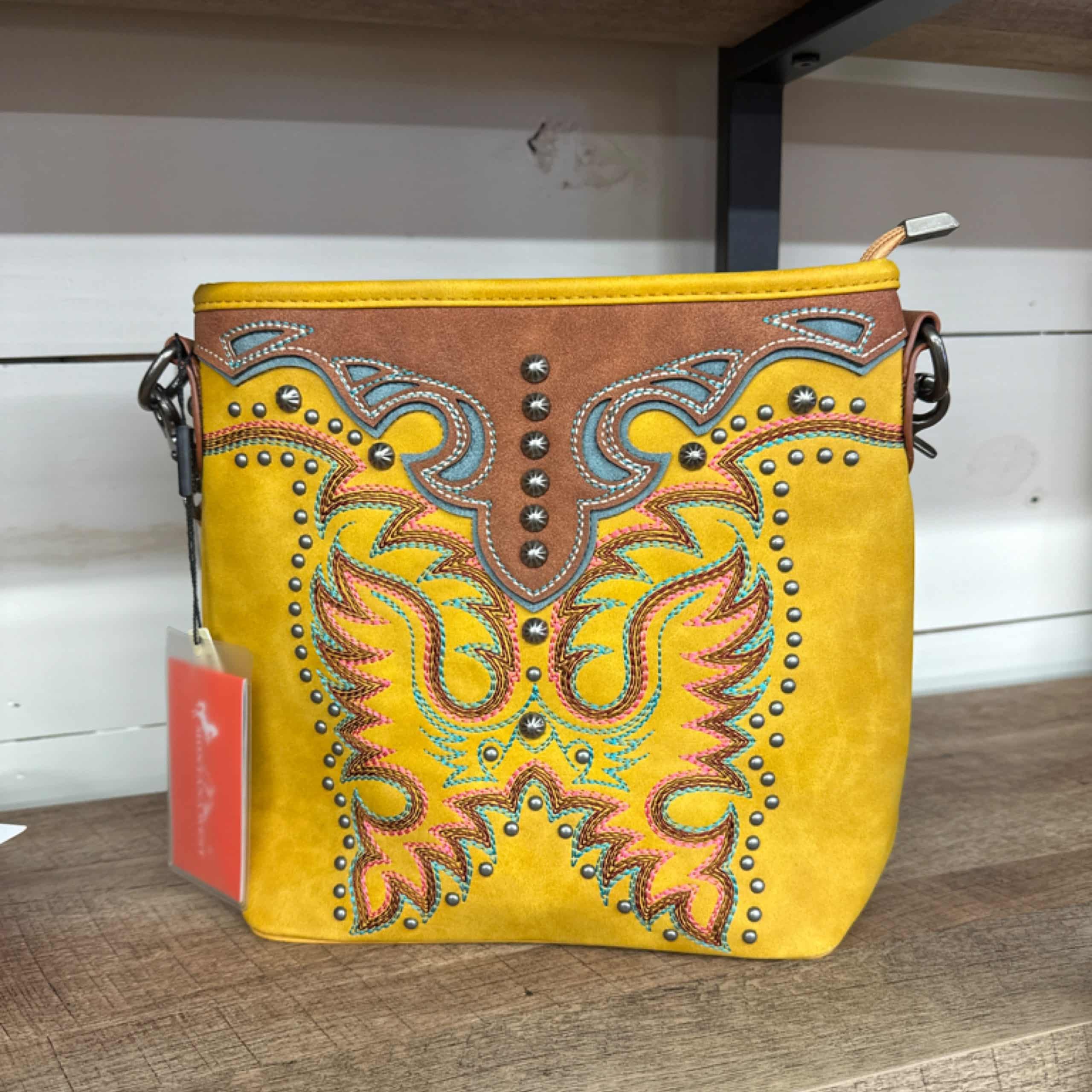 The Montana West Embroidered Mustard Crossbody Bag features a stylish design with intricate embroidery and a convenient crossbody strap for hands-free comfort. Its ample storage space makes it both practical and perfect for everyday use.