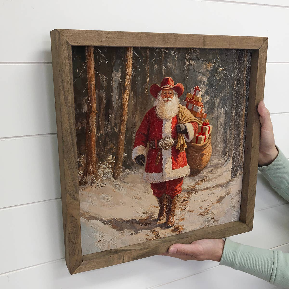 Santa Cowboy Bag of Toys – Christmas Wall Art – Wood Framed: 15×15″ Medium Canvas Art with Thick Wood Frame