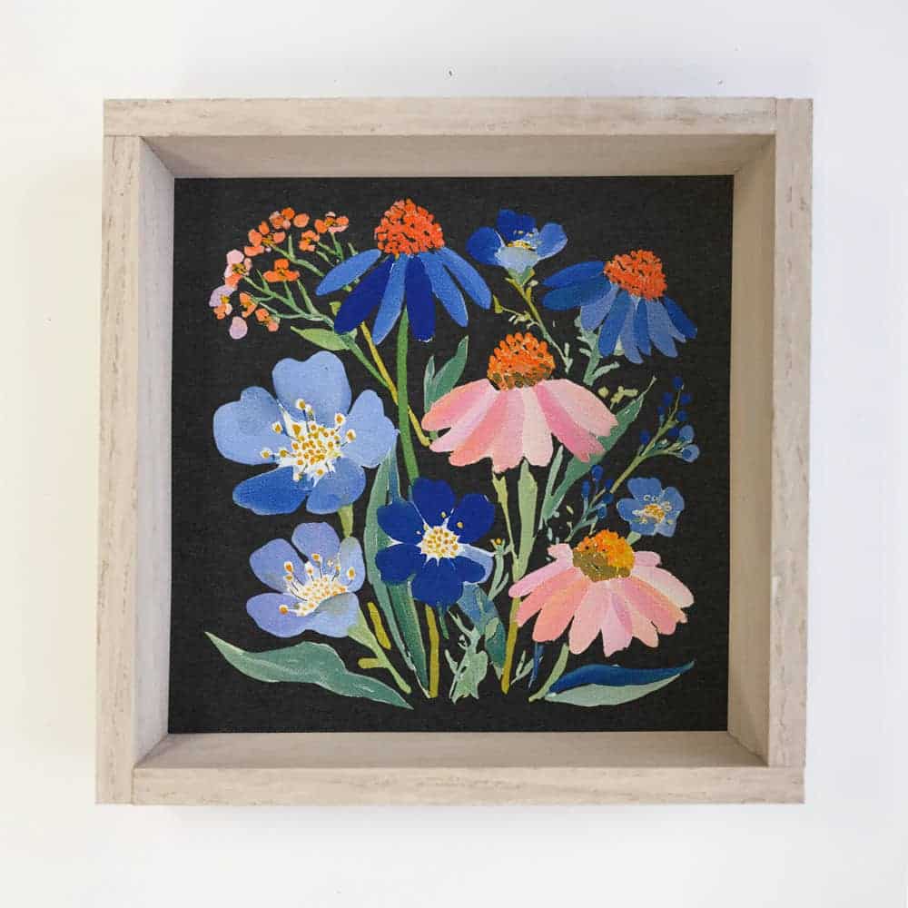 This vibrant floral art print features cheerful blooms against a bold dark background, adding color and charm to any space. Perfect for a modern farmhouse, cottage, or eclectic home, it looks beautiful displayed in a living room, bedroom, or entryway for a fresh, uplifting touch year-round.