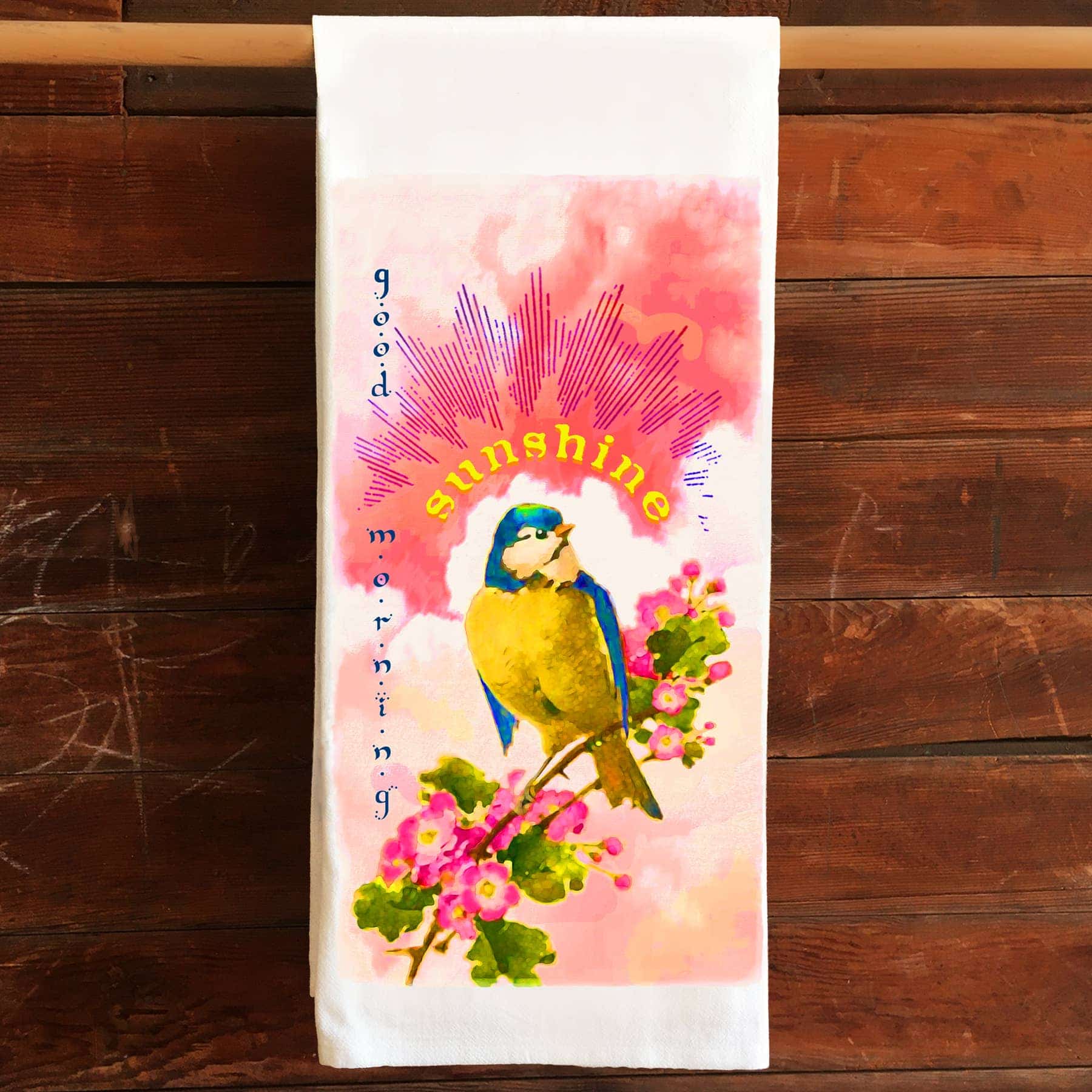 "Good Morning Sunshine" from this sunny little bird. 100% flour sack style cotton. Graciously sized at 24" x 38". Super absorbent, becomes even softer as you wash it, and long wearing ink means colors stay vibrant. Twill loop for hanging.