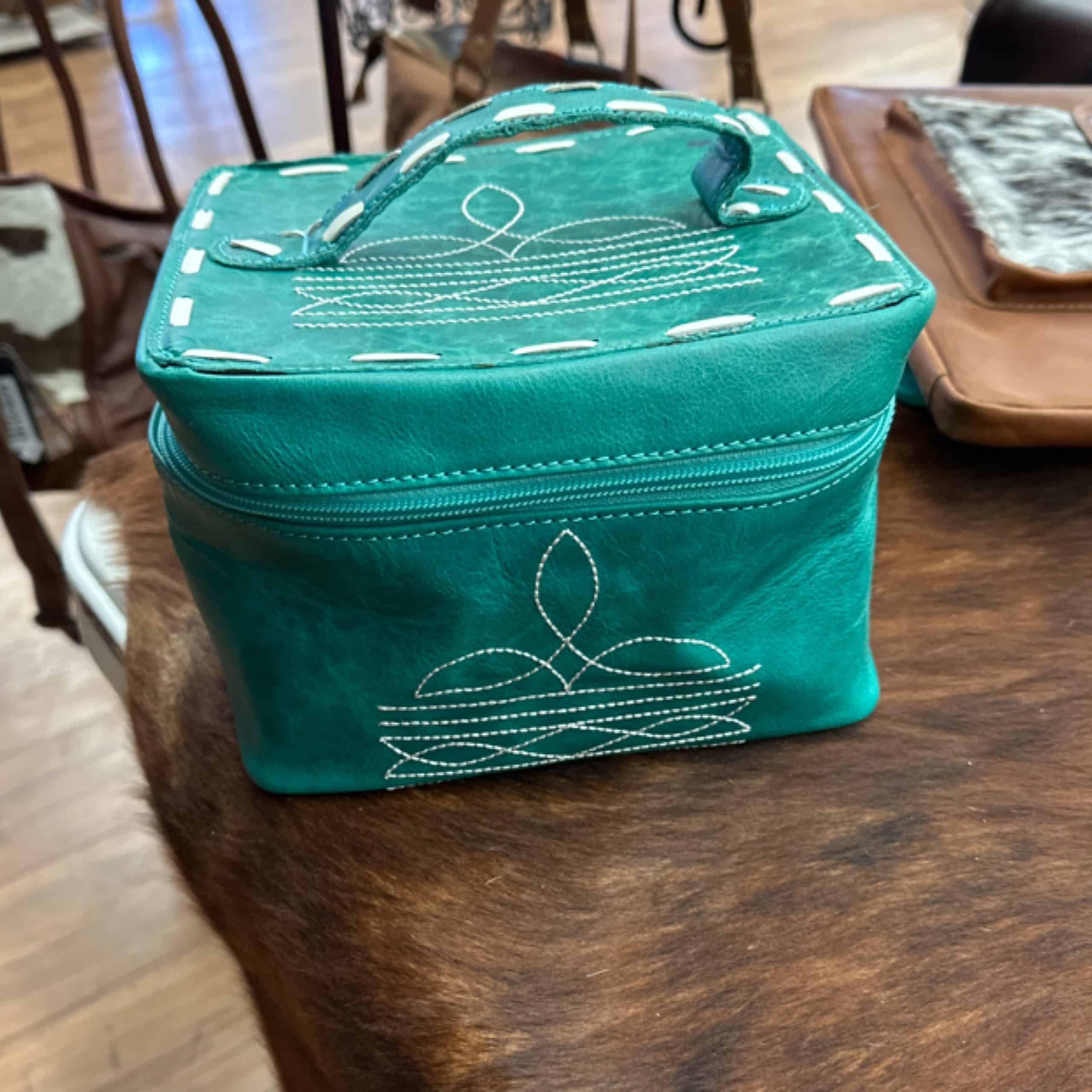 Crafted from genuine leather, the Turquoise Leather Buckstitch Makeup Bag features a unique buckstitch design for a stylish yet practical accessory. Its durable construction and compact size make it ideal for organizing essentials on the go.