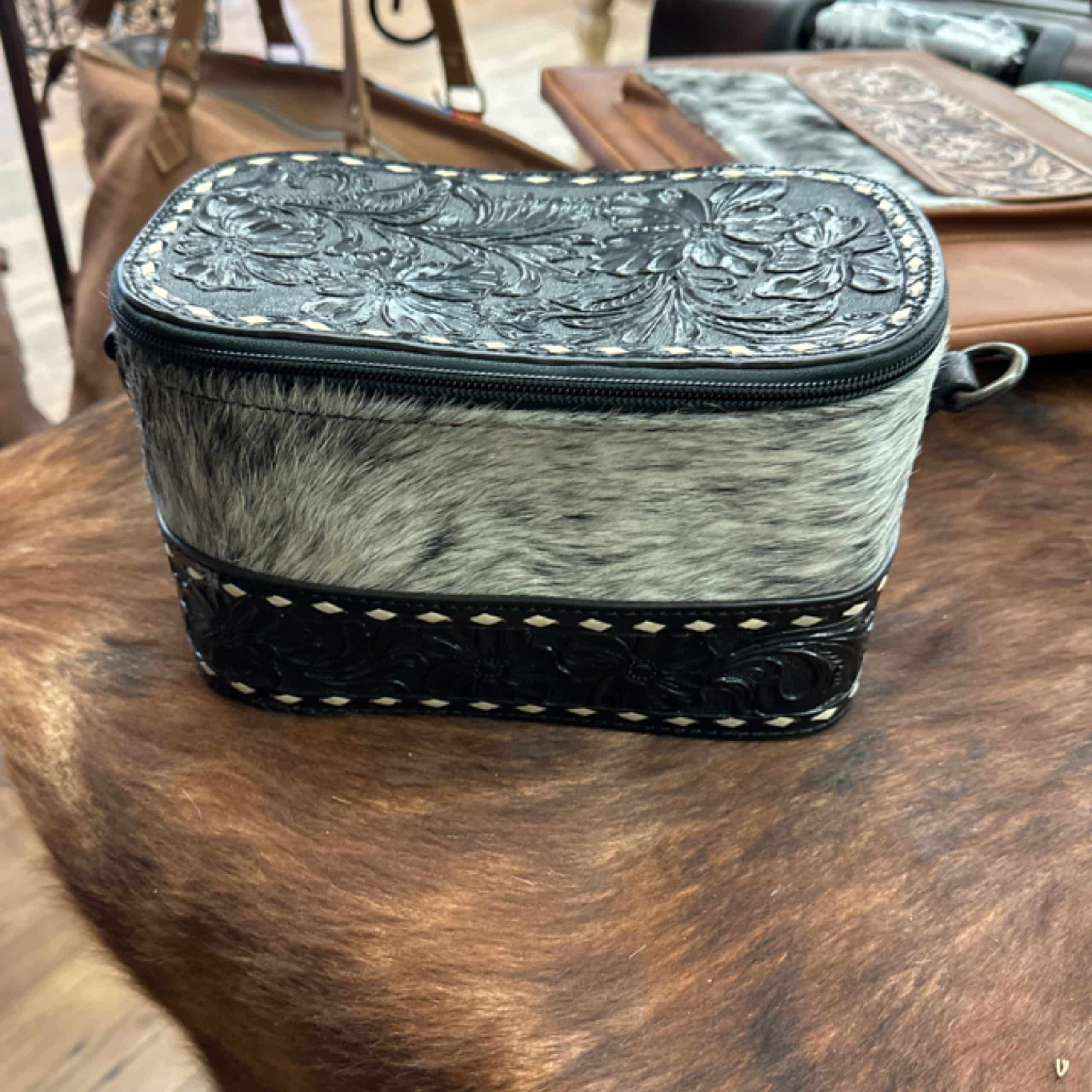 The Western Hide + Leather Case features a rugged, rustic design crafted from durable materials, ensuring long-lasting use. Its secure closure keeps your essentials safe and organized, making it ideal for everyday or travel needs.